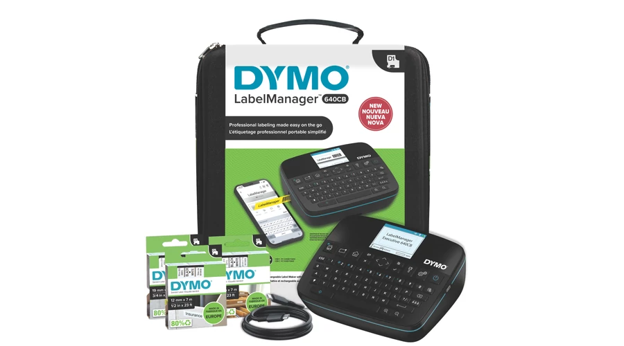 A LabelManager® Executive 640 CB szabványos és tartós D1 szalagokkal működik, melyek 6–24 mm szélességben, sokféle színben és különböző anyagokból választhatók. Tapasztalja meg az út közbeni címkézés kényelmét a LabelManager® Executive 640 CB segítségével. A mobil szakemberek számára tervezett újratölthető lítium-ion akkumulátor és kompakt kialakítás könnyű címkekészítést tesz lehetővé, bárhol is legyen. Texturált markolata kényelmet nyújt a hosszabb használat során, tükrözve elkötelezettségünket az ergonómiai kiválóság iránt. A páratlan olvashatóságot biztosító nagy felbontású képernyővel és a fejlett hozzáférhetőséget biztosító intuitív és világos menünavigációval a LabelManager® Executive 640 CB új mércét állít fel a címkekészítés és személyre szabhatóság terén. Ezenkívül a LabelManager® Executive 640 CB felhasználóbarát kezelőfelülete és kettős csatlakozási lehetőségei, mint például a Bluetooth® Low Energy technológia és az USB-C lehetővé teszik gyakorlatilag korlátlan* személyre szabott címkék elmentését a DYMO® mobil és asztali szoftveralkalmazásain keresztül, elősegítve az egyszerűsített munkafolyamatot, és nincs szükség az eszköz párosítására sem. Akár a munkahelyén, akár a terepen dolgozik, a LabelManager® Executive 640 CB páratlan hatékonyságot és pontosságot biztosít a címkézési feladatok során.